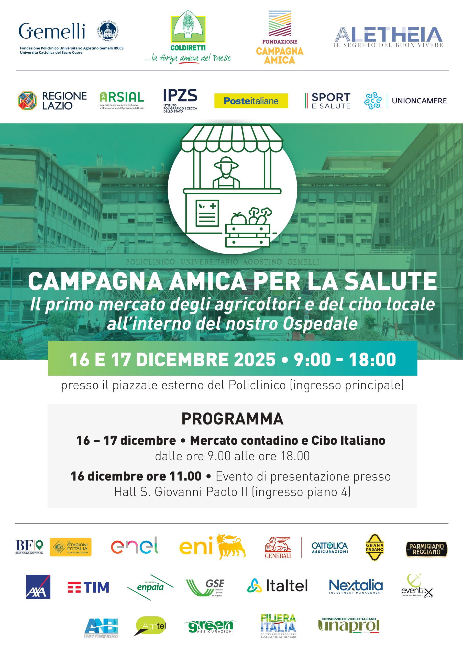 All’inaugurazione, in programma martedì 16 dicembre, alle ore 11,00 presso la hall del Policlinico, saranno presenti il Ministro dell’Istruzione Giuseppe Valditara, il ministro dell’Agricoltura e della Sovranità alimentare Francesco Lollobrigida, il sottosegretario alla Salute Marcello Gemmato, e il Presidente della Regione Lazio Francesco Rocca, assieme a Vincenzo Gesmundo, Segretario Generale di Coldiretti, Ettore Prandini, Presidente Nazionale Coldiretti, Daniele Franco, Presidente Fondazione Policlinico Gemelli IRCCS, Antonio Gasbarrini, Presidente CS Fondazione Aletheia e DS Fondazione Policlinico Gemelli IRCCS, Dominga Cotarella, Presidente Fondazione Campagna Amica, Daniele Piacentini, Direttore Generale Fondazione Policlinico Gemelli IRCCS, oltre a dirigenti di Coldiretti, ai rappresentanti della Fondazione Aletheia e al personale medico del Gemelli.