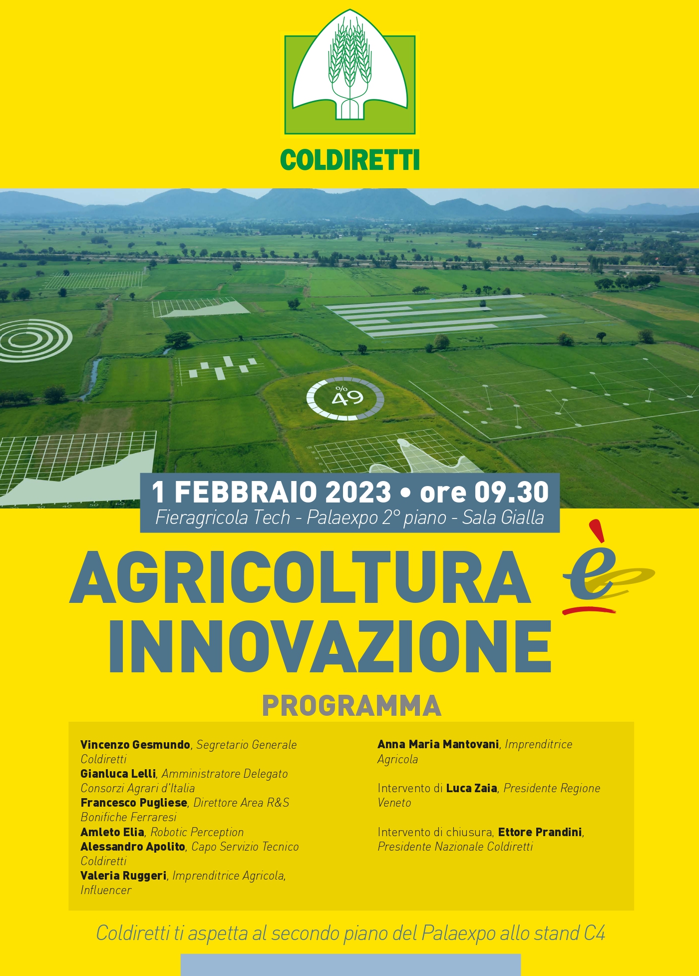 Ad aprire Fieragricola Tech è l’incontro “Agricoltura è innovazione” in programma alle ore 9.30 di mercoledì 1° febbraio nella Sala Gialla al secondo piano del Palaexpo con la partecipazione del Presidente Prandini e del Presidente della Regione Veneto Luca Zaia. Dopo l’introduzione del Segretario Generale Coldiretti Vincenzo Gesmundo, sono previsti tra gli altri gli interventi di Gianluca Lelli (Amministratore Delegato Consorzi Agrari d’Italia), Francesco Pugliese (Direttore Area R&S Bonifiche Ferraresi), Amleto Elia (Robotic Perception).